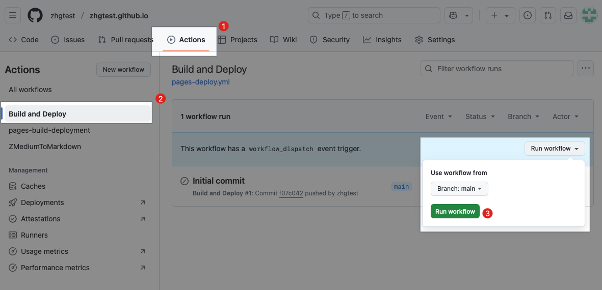 • Repo -> 「Actions」->「Build and Deploy」->「Run workflow」->「Branch: main, Run workflow」