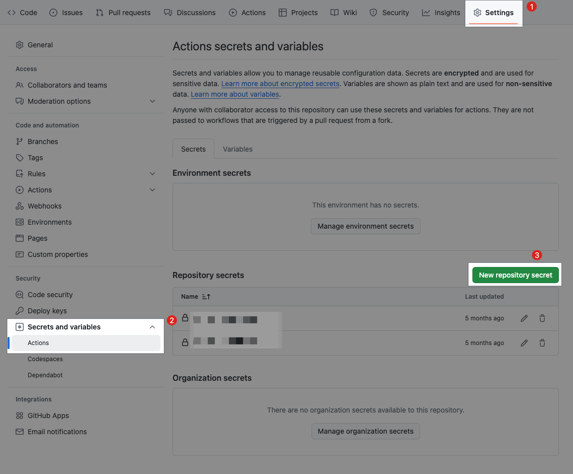 1. Github リポジトリの Settings -> Secrets and variables -> Actions -> New repository secret に移動する