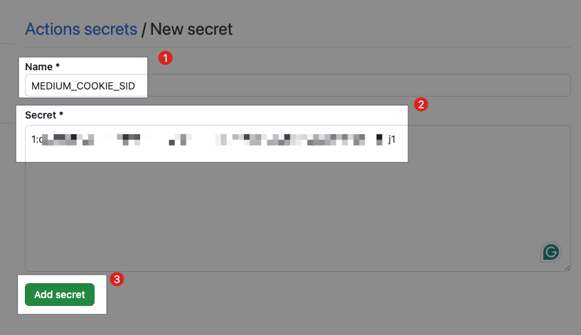 • Secret: 前のステップでコピーした Medium アカウントの sid 値を貼り付けてください