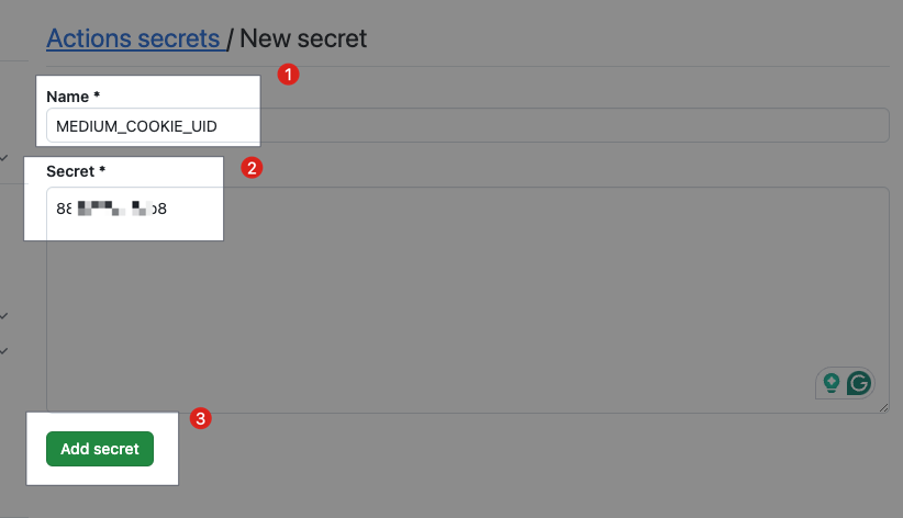 • Secret: 前のステップでコピーした Medium アカウントの uid 値を貼り付けてください