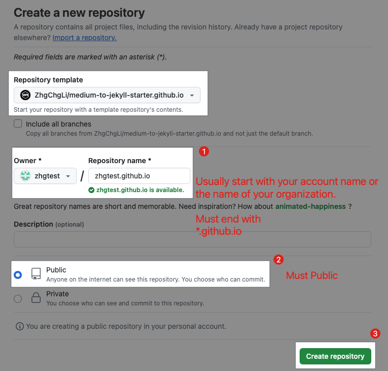• リポジトリ名:通常は アカウント名または組織名.github.io で、必ず *.github.io で終わる必要があります。