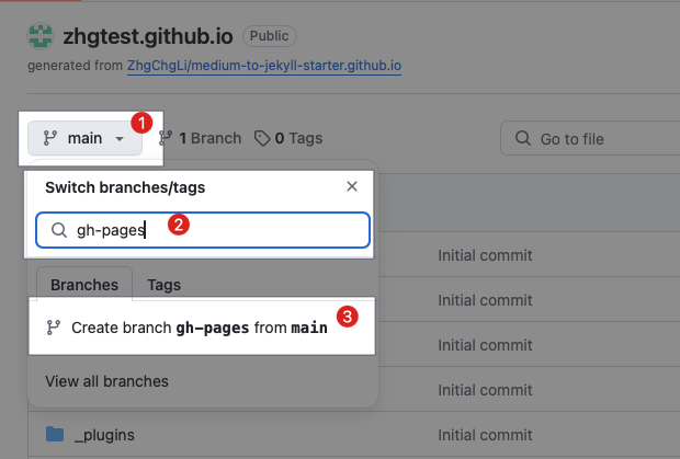 • リポジトリのトップページで「main」ブランチのメニューをクリックし、「gh-pages」と入力します。存在しない場合は「Create branch gh-pages from main」を選択してください。