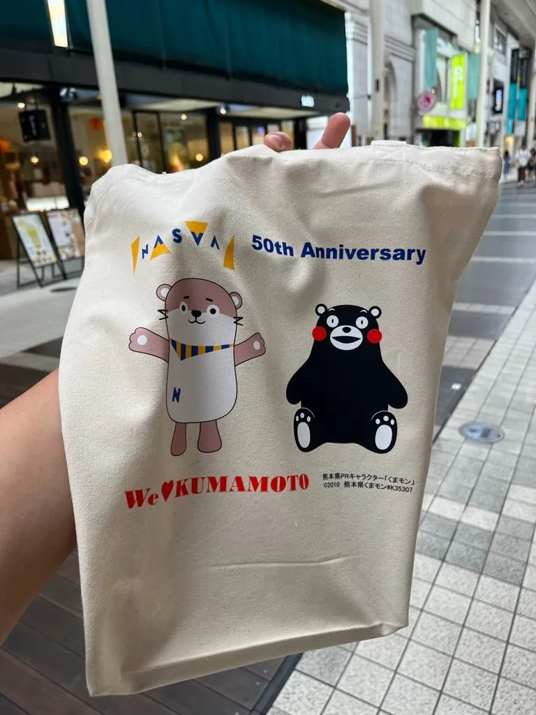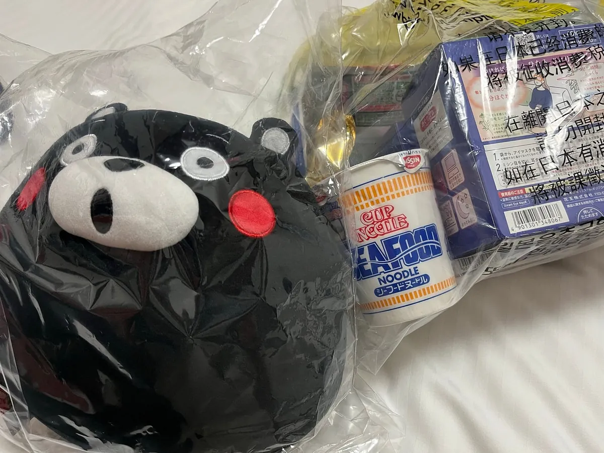 路面電車に乗っていたら、かわいい熊本のおじいちゃんおばあちゃんに出会いました。免税品の透明な袋に入った日清のカップ麺を指さして「すごいね~」と言われ、私は「Good! Good!」と答えました。