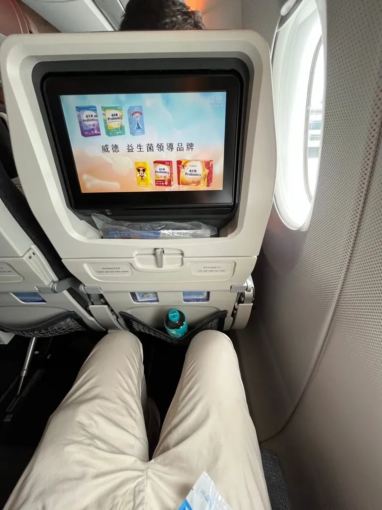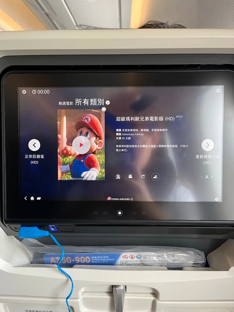 帰りの飛行機は新しく、映画でスーパーマリオブラザーズがあり、見終わったらちょうど台湾に着きました。席も満席ではなく、一人で一列まるごと使えて快適でした!