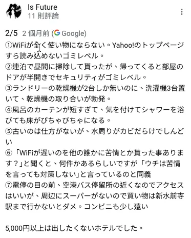 日本でホテルを探すときは評価をよく見るべきです。特に低評価の内容を確認して、自分が許容できるかどうか判断し、さらにストリートビューで実際の周辺環境を確認すると良いです。今回の熊本滞在は日数を多く取りすぎたので、2日で十分でした。残りの日は大分に行くのが良いです。また、福岡から熊本は福岡から長崎よりずっと近いです。