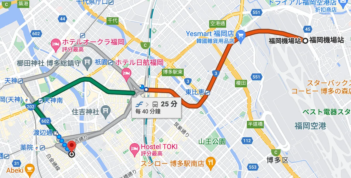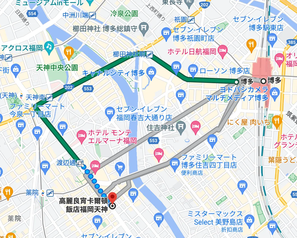 地下鉄で博多に行くのは遠回りなので、直接歩いて渡辺通まで行き、バスで博多に行く方が速いです。