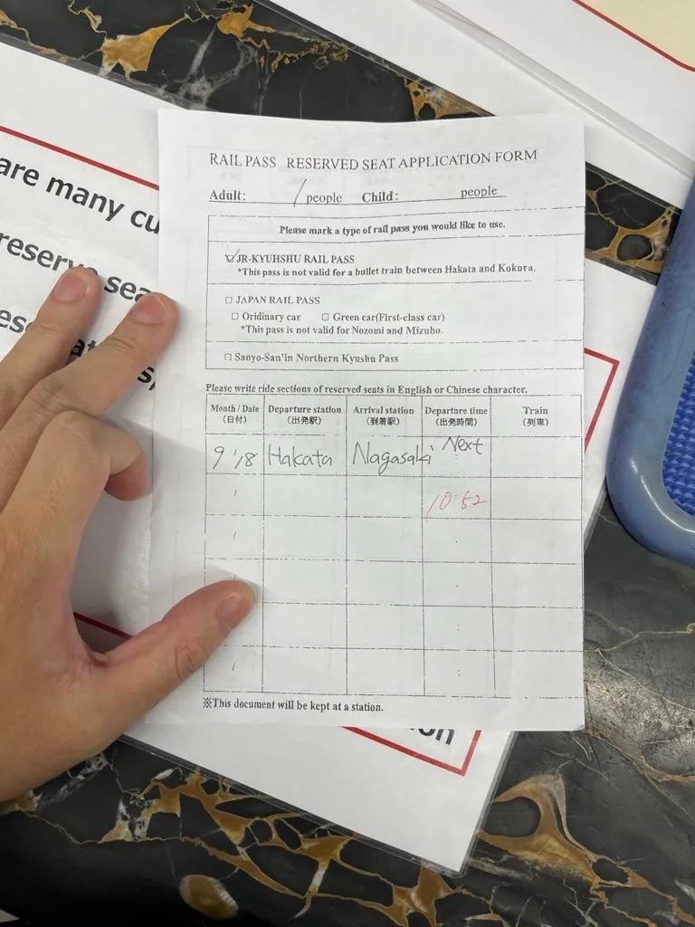 博多に着いたら、まず有人カウンターでJRパスを交換(パスポート提示)し、長崎行きの座席を予約します。JRパスを交換する外国人が多く、約1時間近く並びました。早めに出発するか、事前に交換することをおすすめします。