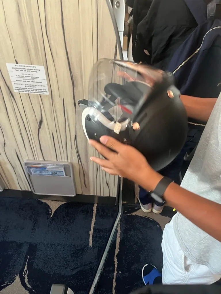 飛行機を降りたときに、前の人がヘルメットをかぶっているのを見ました。バイクに乗って飛行機に来たのでしょうか🤣