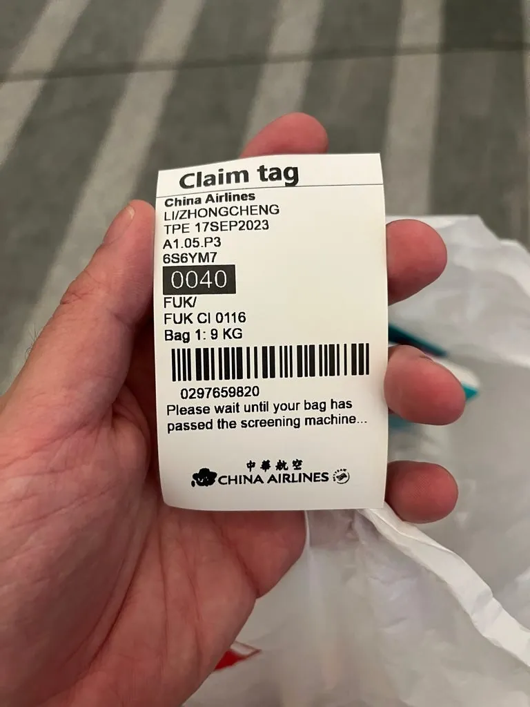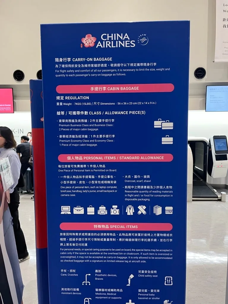 だいたい10:20頃にチェックイン/手荷物預けが開始されます。以前はエバー航空を利用していて手荷物は2個まで持ち込み可能でしたが、今回はチャイナエアラインで1個しか持ち込みできないことに気づき、現場で急いで1個にまとめました。