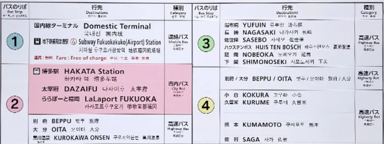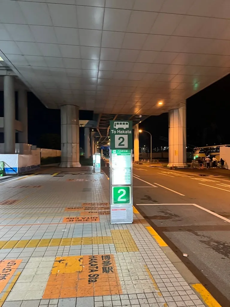 空港を出ると、行き先の方向とどのバス停で乗るかを示す案内板があります。博多だけでなく他の場所へも行けますので、こちらの記事 や 公式サイト を参考にしてください。遠くへ行く場合は、事前に時刻表を確認しましょう。