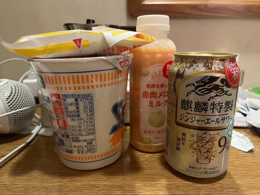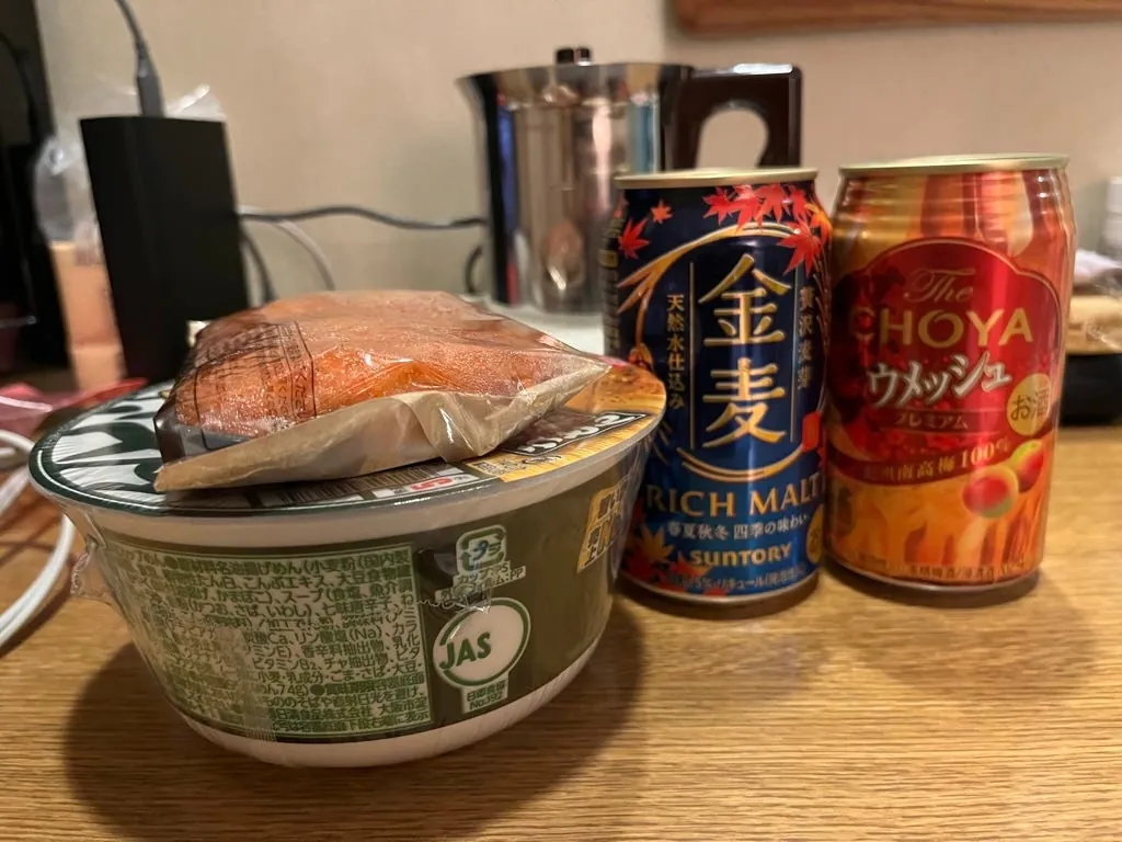 生ビール、ピーチウォーター、ファミリーマートのジュース、秋雅梅酒、美味しい!