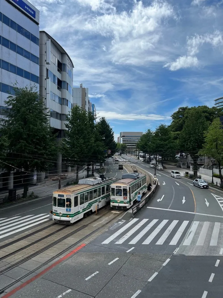 市役所を出て桜町ショッピングセンター方向に歩くと、歩道橋を通ります。ここは熊本の路面電車を撮影するのに最適なスポットです。