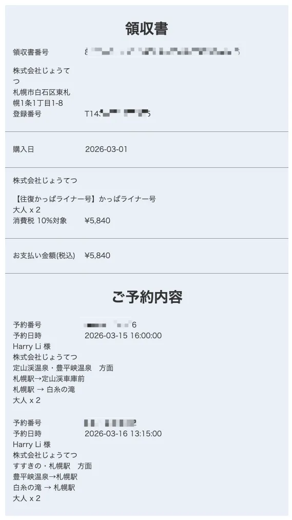 ルート(1) — かっぱライナー号 / Kappa Liner は最も便利でスムーズです。便を調べたところ、飛行機到着後に入国してJRで札幌駅まで行き、駅を出て午後4時発(秋冬限定便)の時間に十分間に合うので、先にネットで予約しました(外国人も可能です!)。