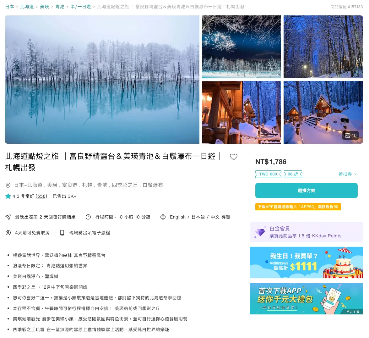 KKday 日帰りツアー:北海道イルミネーションツアー|富良野エルフ台&美瑛青い池&白髭の滝日帰りツアー|札幌発