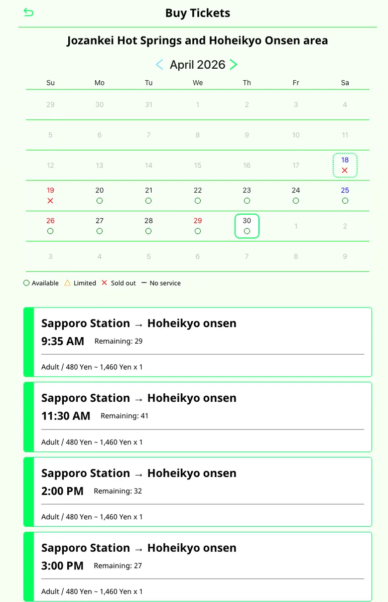 札幌駅 <-> 定山渓 往復バスチケット
