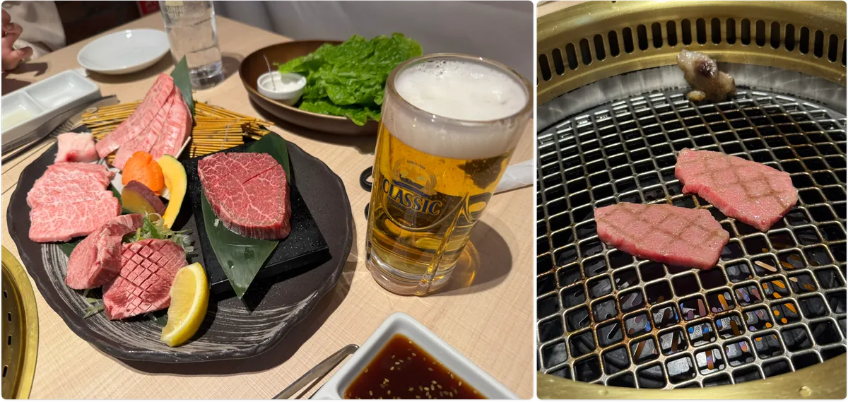 北海道牛セット+サラダ+ビール+ドリンク+冷麺を注文し、合計で約NT$3,100でした。和牛は脂が豊富で口の中でとろけ、ステーキも美味しかったです。特に驚いたのは牛タンで、とても弾力があり美味しかったです。