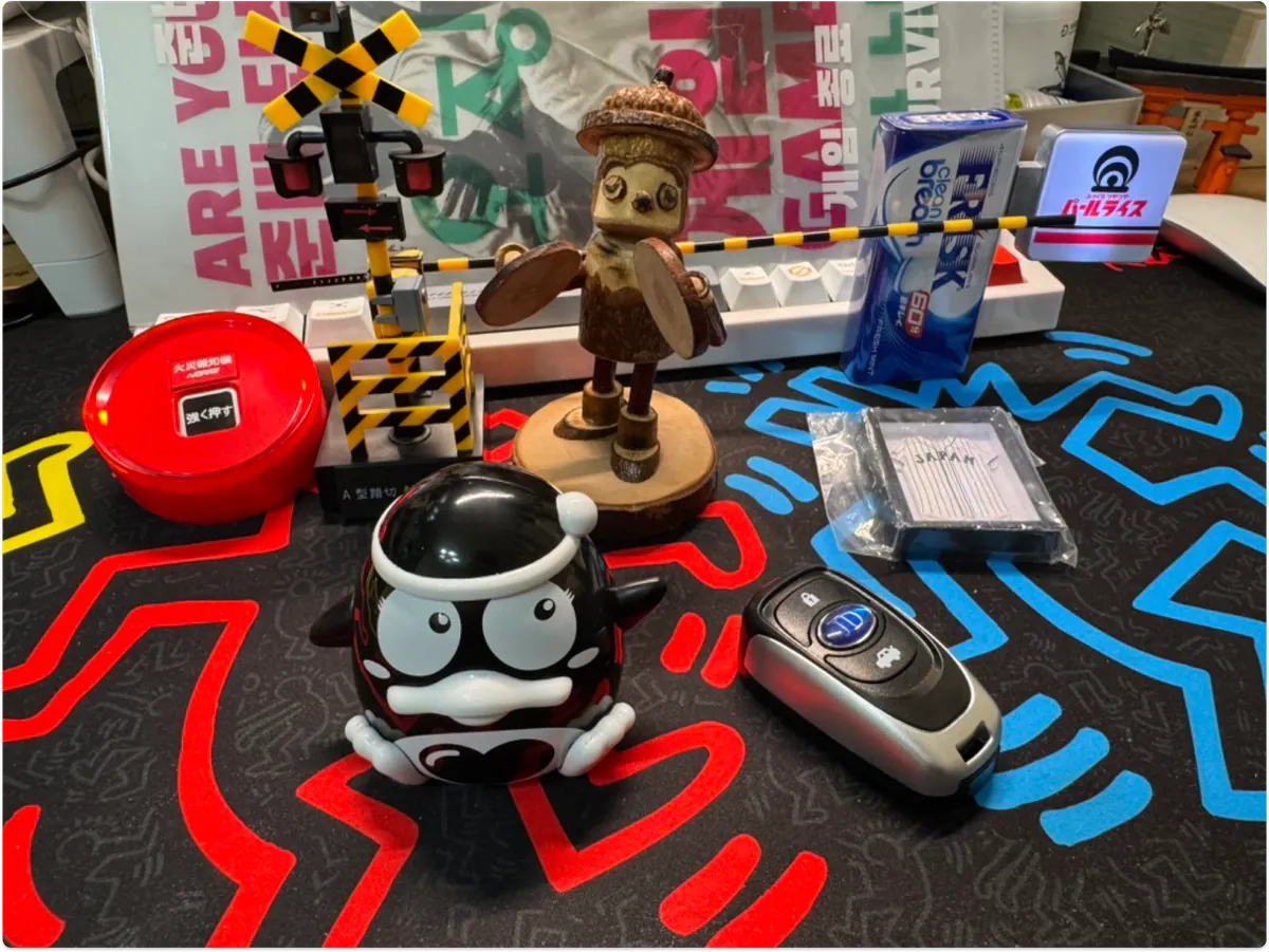 踏切のバー、看板のライト、車の鍵、火災報知器、ドン・キホーテのフィギュア、日本代表チームのユニフォーム