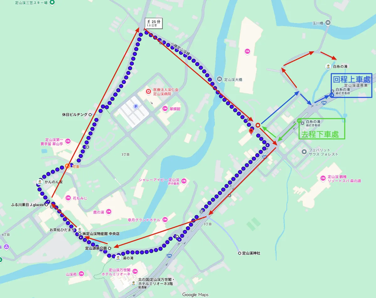 後で気づきましたが、ぐるっと一周して(7) 定山渓温泉東2丁目 / Jozankei onsen higashi 2 chomeで降りれば、ホテルの目の前です。