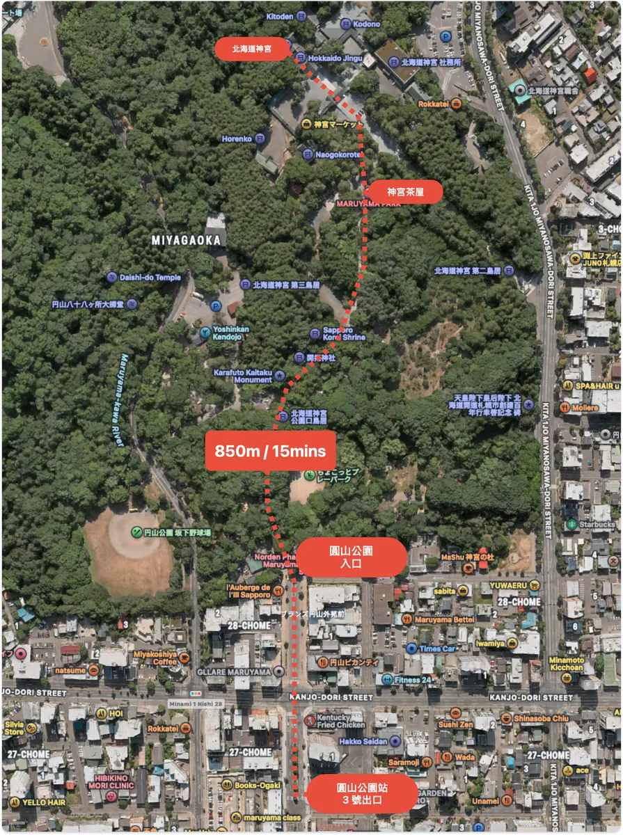 札幌から南北線で大通駅まで行き、東西線に乗り換えて円山公園駅へ。所要時間は約30分です。