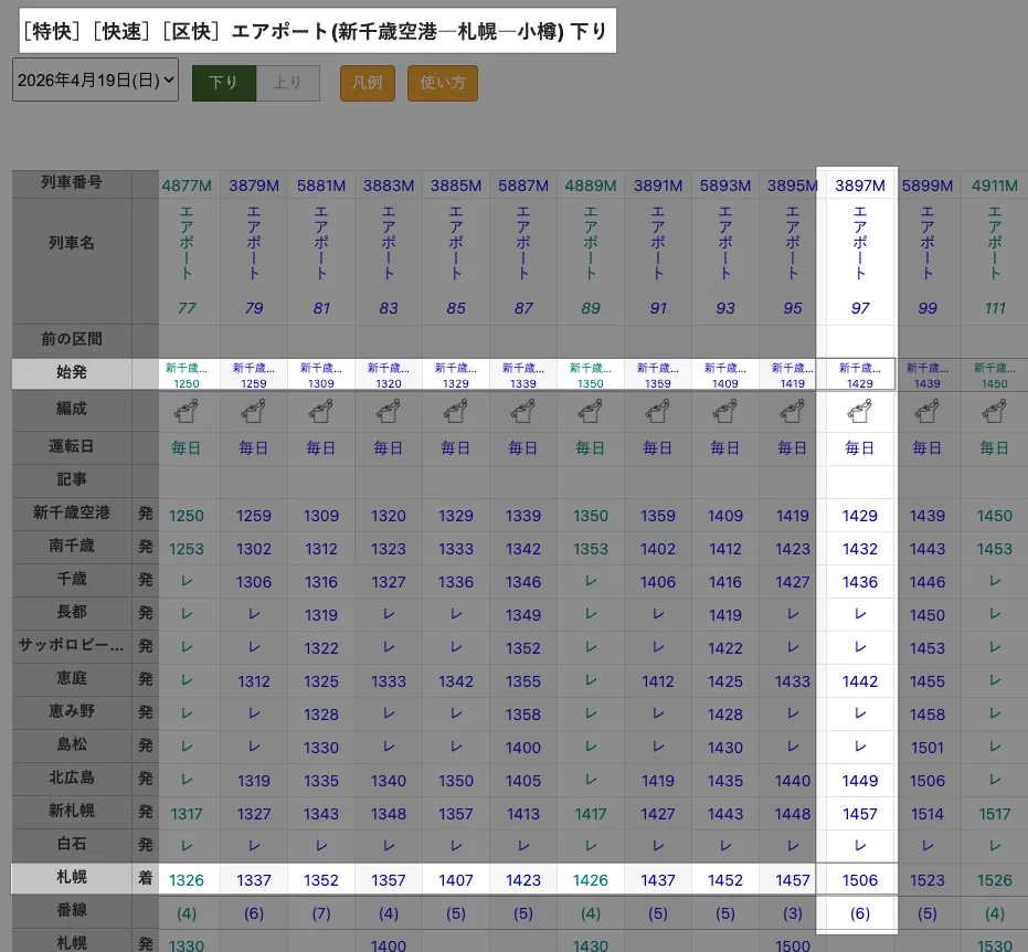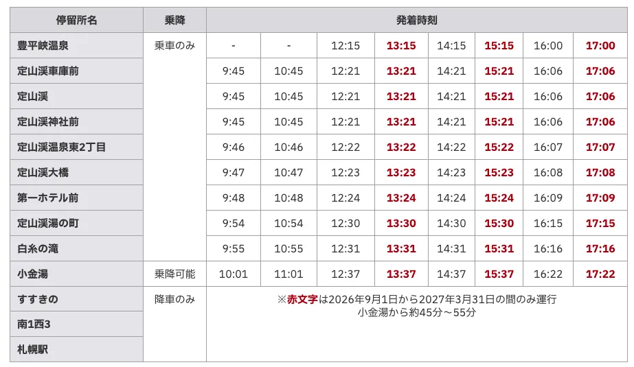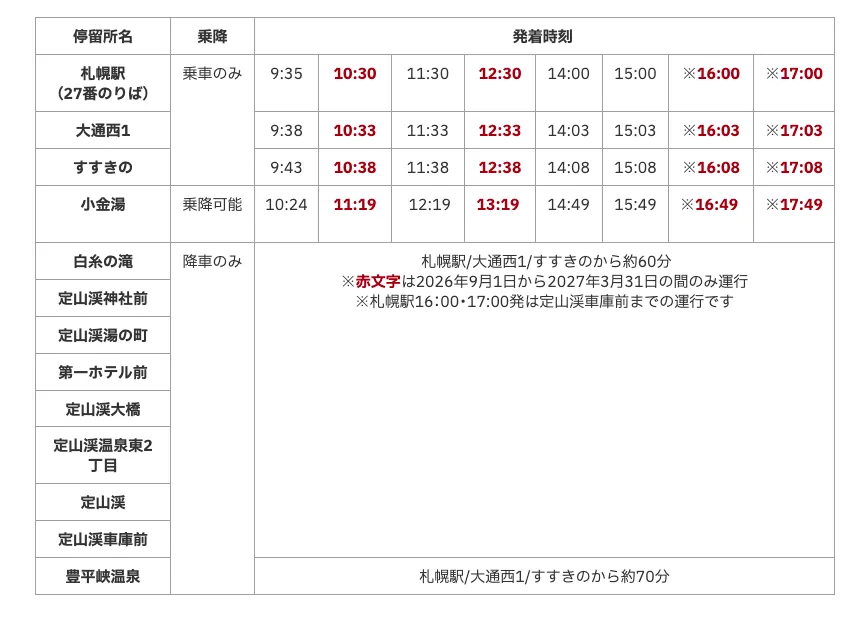 - 注意すべきは、赤字の便は秋冬季のみ運行であり、札幌駅16:00/17:00発の便は定山渓車庫前までの運行です。