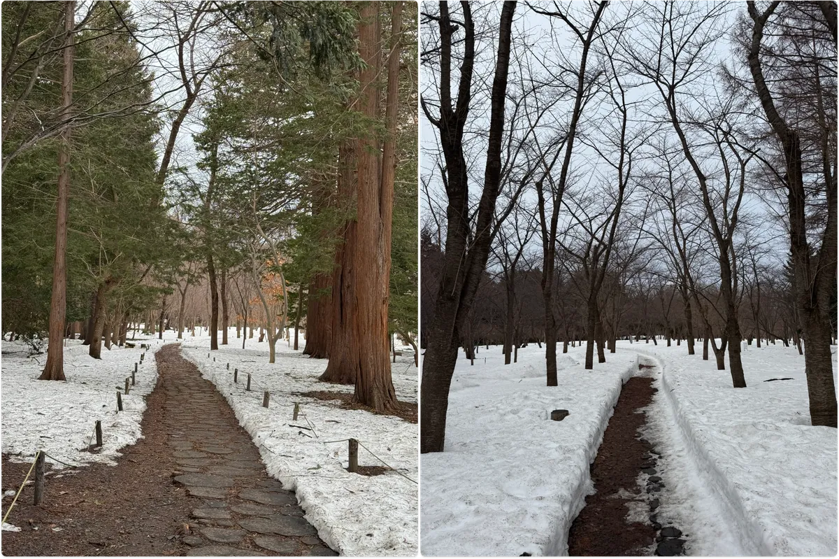 まず円山公園を通り抜けます(ここにはまだ多くの積雪があります)、すると神宮の鳥居入口が見えます: