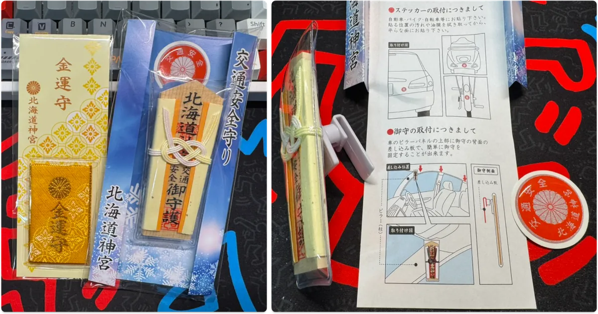 御守を二つ購入しました。特に珍しいのは交通安全の御守で、車内に掛けられるものと、バイク、自転車、ヘルメットに貼れるステッカーがあります。