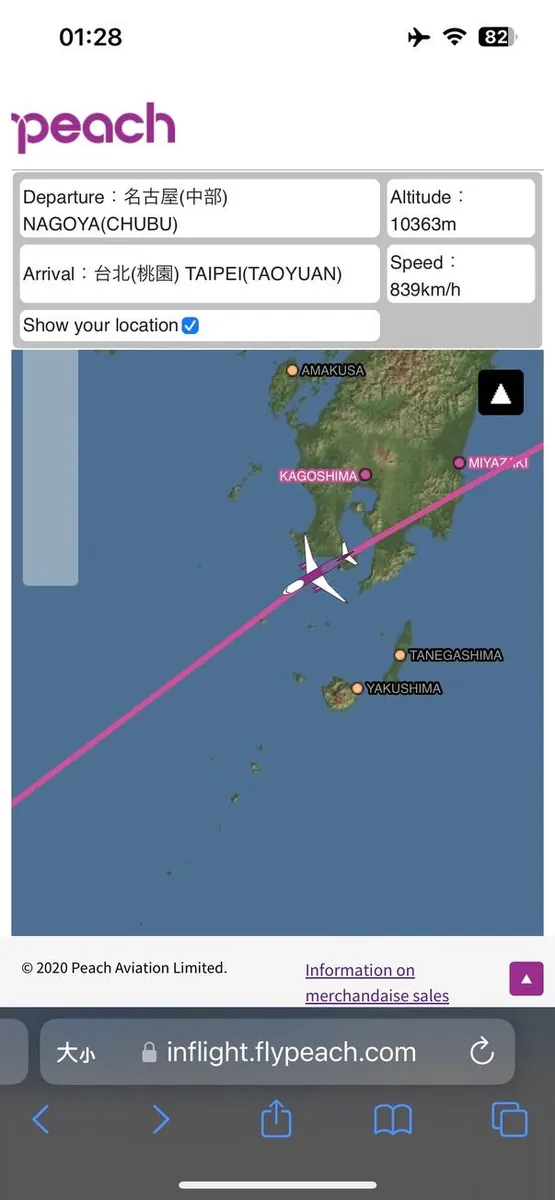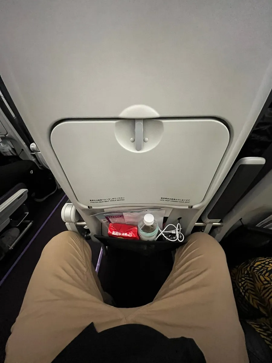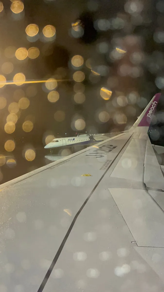席は非常に狭く、通路側で頭をもたれる場所がありませんでした。幸い、ネックピローを持っていたので多少支えになりましたが、エンジンの轟音と首の痛みでほとんど眠れず、そのまま名古屋まで揺られ続けました。機内には飛行距離を表示するスクリーンもなく、時間が非常に長く感じました。