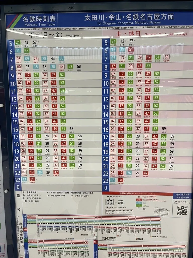 ただし、節約と便利さを重視するなら、現地で準急券を購入するか、直接駅に入って普通列車に乗るだけで十分です。以下に列車の時刻表と停車駅を添付します。または、名鉄のウェブサイトで確認してください: