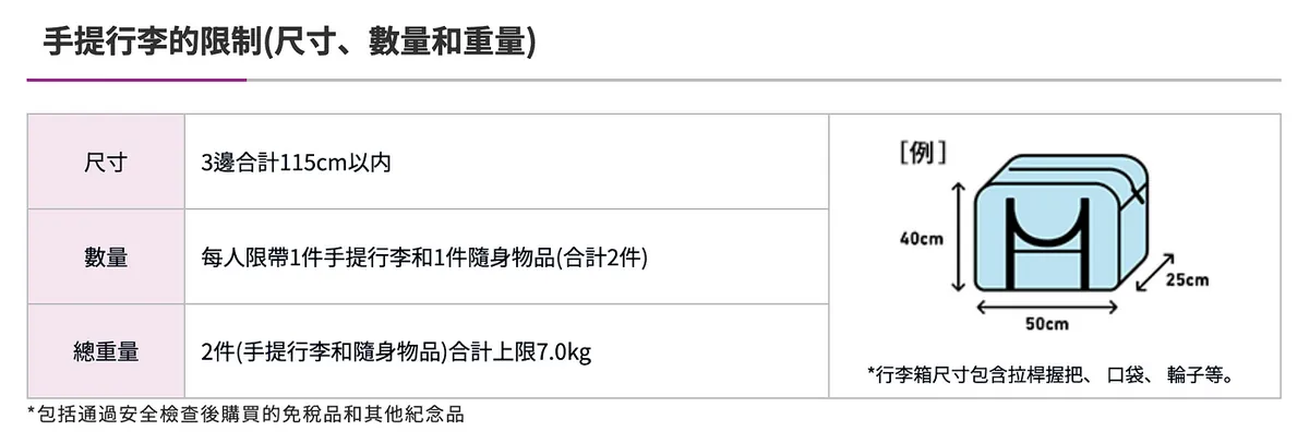 手荷物規定:お一人様2個まで&合計7キロ未満