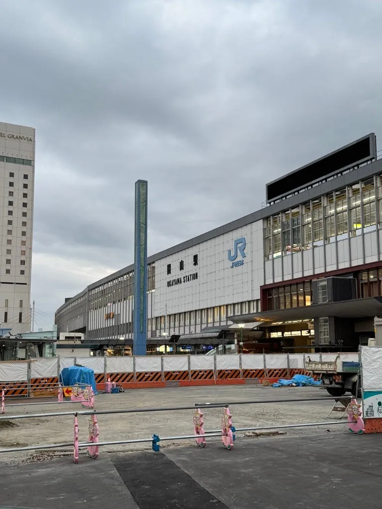 工事中の岡山駅と、一時的に駅の隣に移された桃太郎。