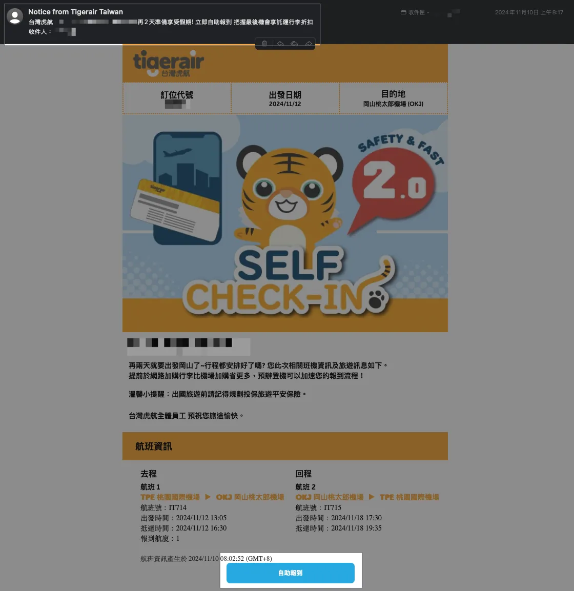 出発の1〜3日前に、タイガーエアから旅程通知メールが届きます。必ず!必ず!必ず! 出発前にオンラインで「セルフチェックイン」を完了してください: