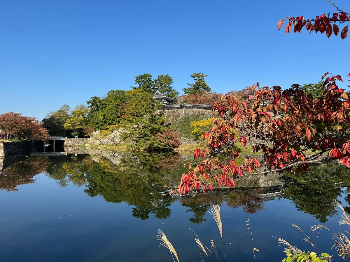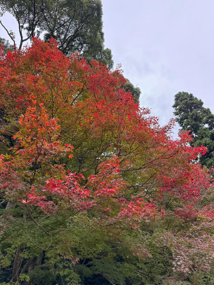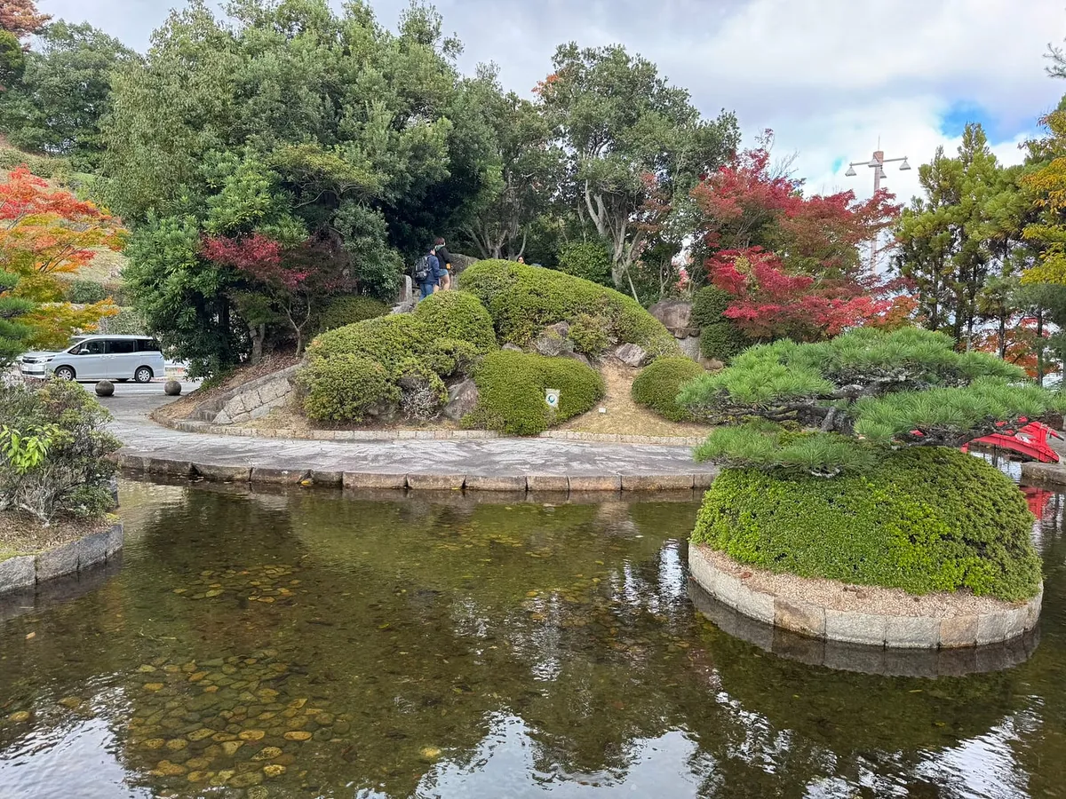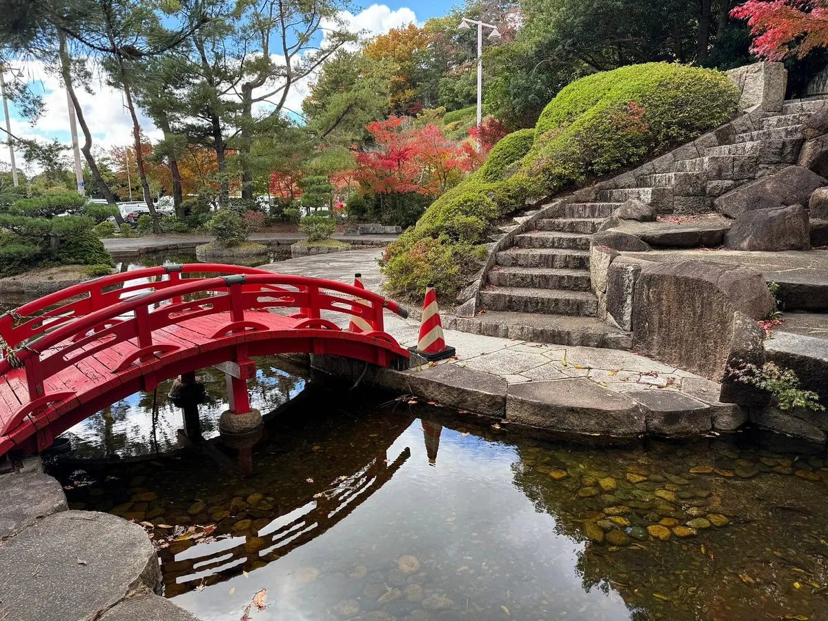 空港の近くをぶらぶらしていると、空港の外に小さな岡山後楽園と人気の紅葉がありました。