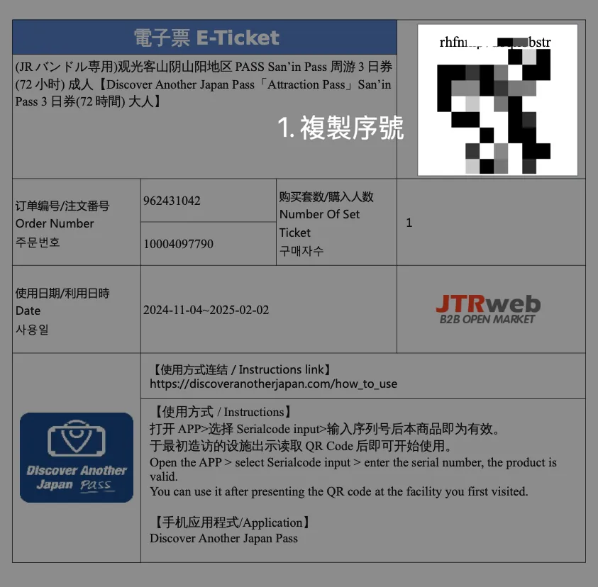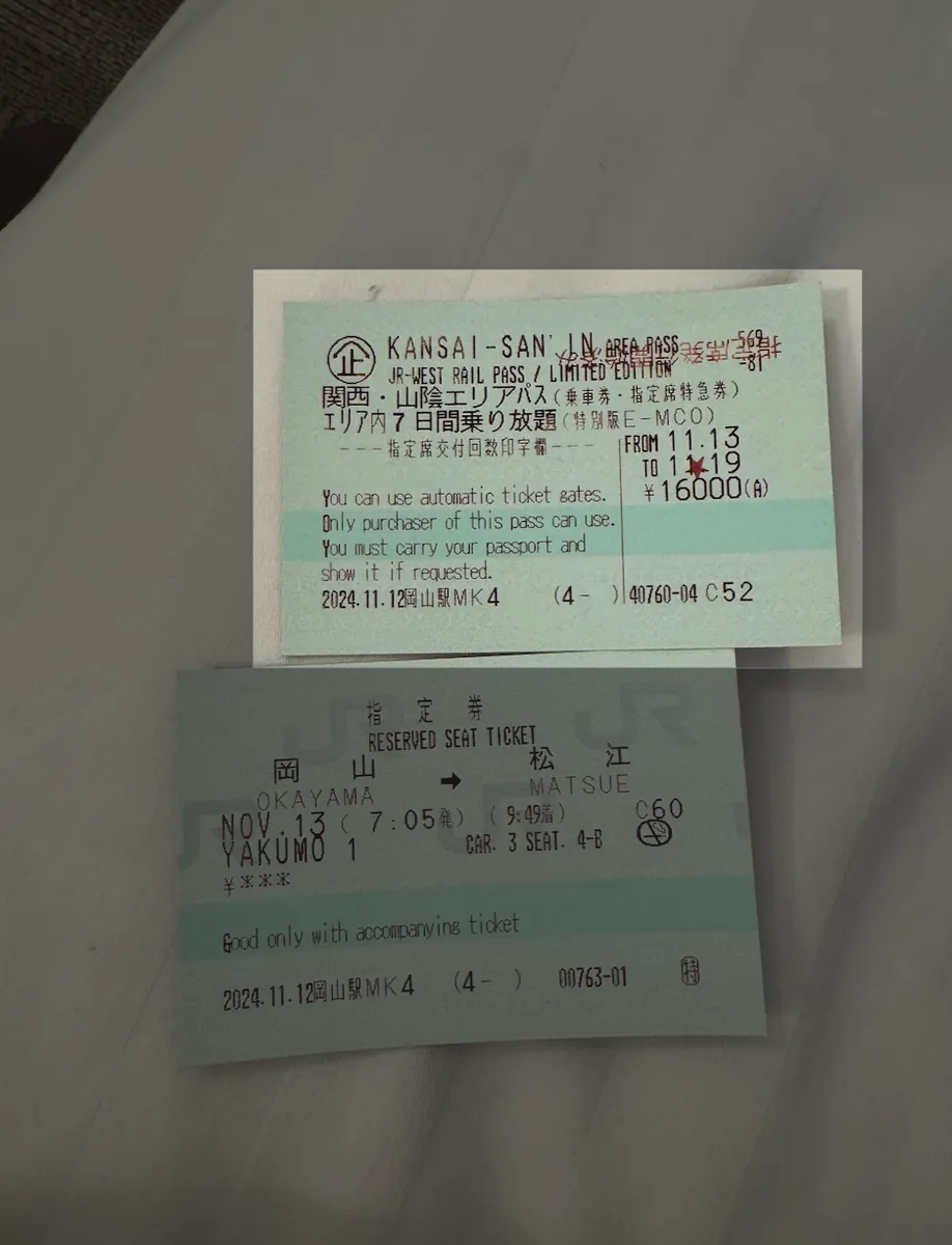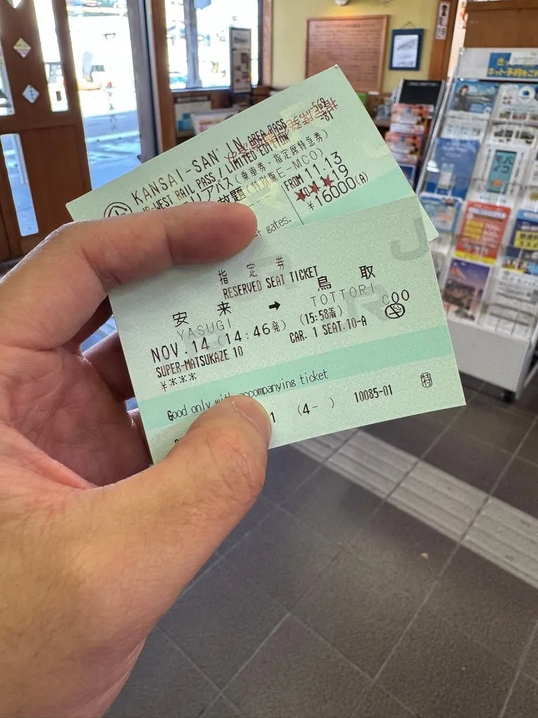 今回も長距離移動なので、必ずJRパスを購入しました。最初は山陰・山陽のJRパスだけかと思っていましたが、日本のJRはとても親切で、可能な路線をすべてカバーした「関西&山陰地域鉄道周遊券 JRPass」があり、まさに私の希望にぴったりでした!
