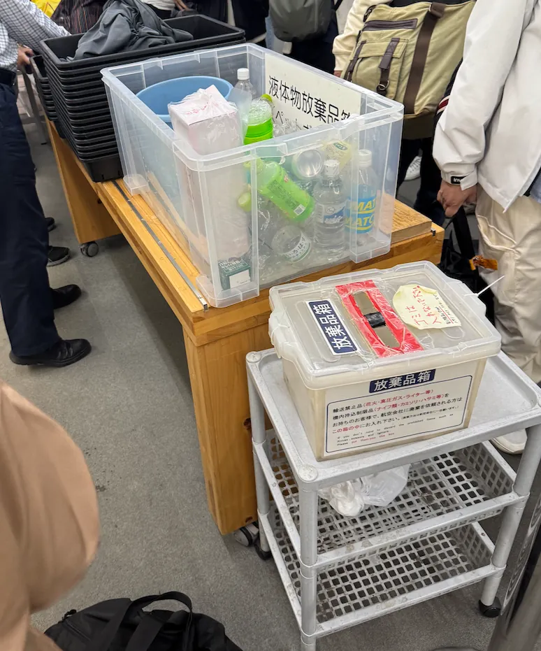 ここは荷物の一括検査エリアで、預ける荷物はX線検査を受け、封印シールが貼られます。預けない荷物は不要です(出国前のセキュリティチェックで他の荷物はスキャンされます)。預ける荷物がなくても列に並ぶ必要があります。 列が進んだら、スタッフに預ける荷物がないことを伝えて直接通過してください。もしシールを貼った後にスーツケースを開けると、再度スキャンとシール貼り直しが必要になります。⚠️⚠️⚠️