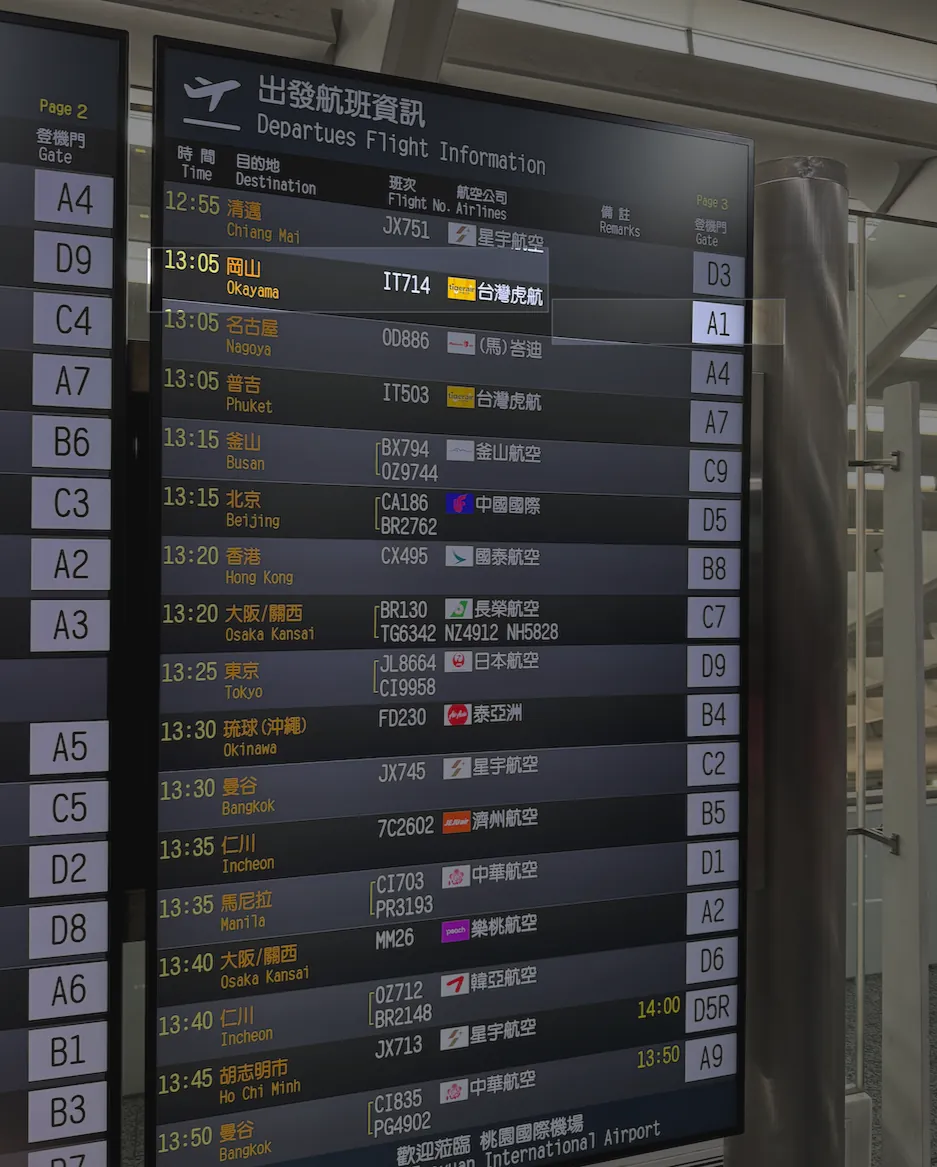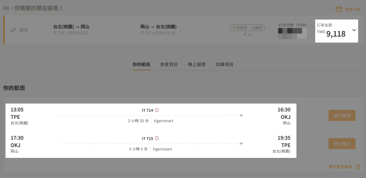 行き:13:05 TPE 台北桃園国際空港 -> 16:30 OKJ 岡山桃太郎空港