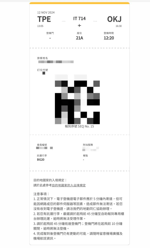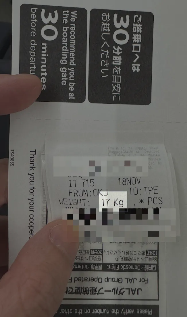搭乗券を大切に保管してください。これを持って空港に行けば、「手荷物自動預け機」で直接荷物を預けることができ、長い「一般チェックイン」カウンターで並ぶ時間を節約できます。