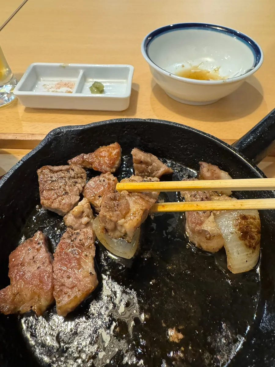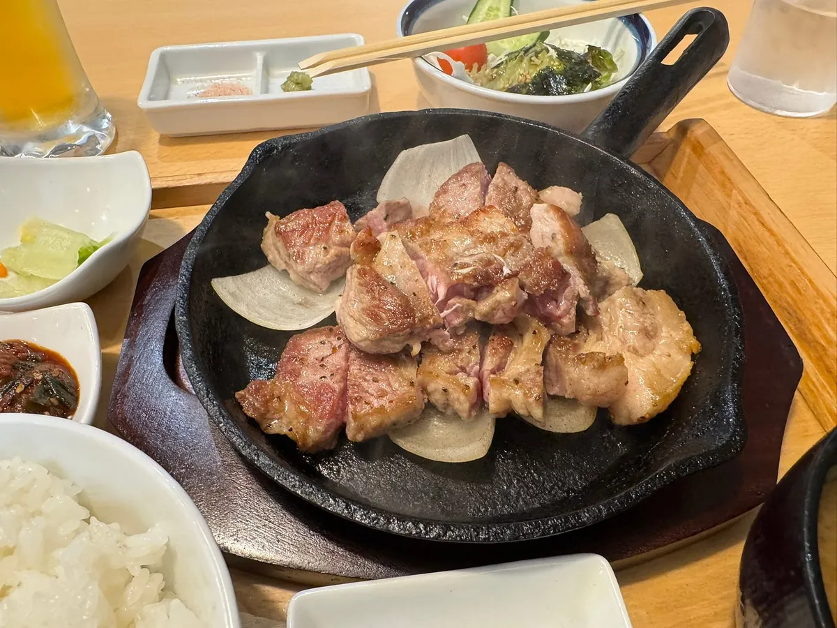意外だったのは、トンカツが提供されたときに完全に火が通っておらず、約7分火が通っている状態だったことです。レビューや紹介を調べたところ、どうやらこの店の特徴のようですが、私は鉄板が熱いうちに火が通りそうな肉の部分をしっかり火を通しました。