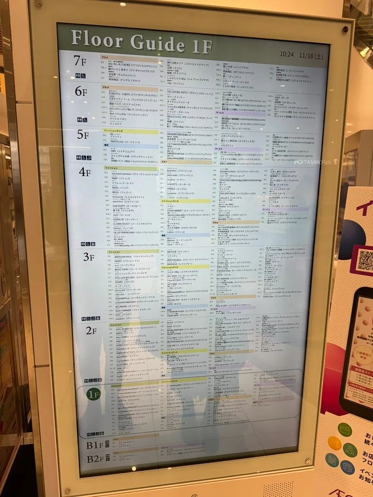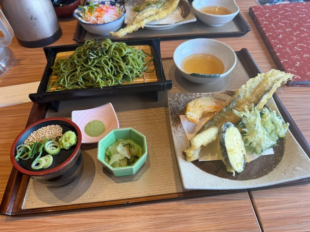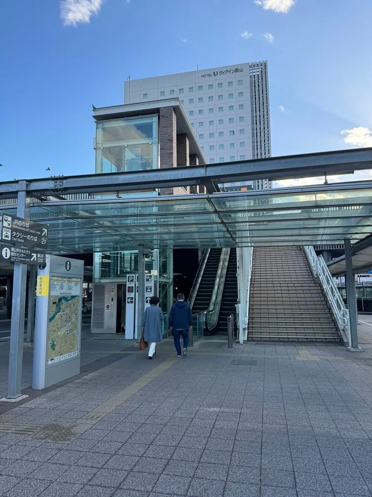 岡山駅に戻った後、近くのイオン百貨店でお土産を買い、街を散策し、天ぷらそばの昼食をとりました。そして、空港行きのバスに乗るために並ぶ準備をしました。