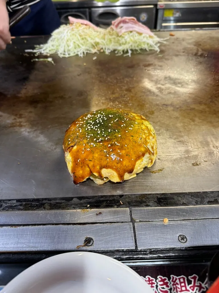 年越しもち入りのお好み焼き(中に焼きそばが入っている)を注文しましたが、味は普通で、麺ともちが入っていて、食べ終わるととても満腹になりました。