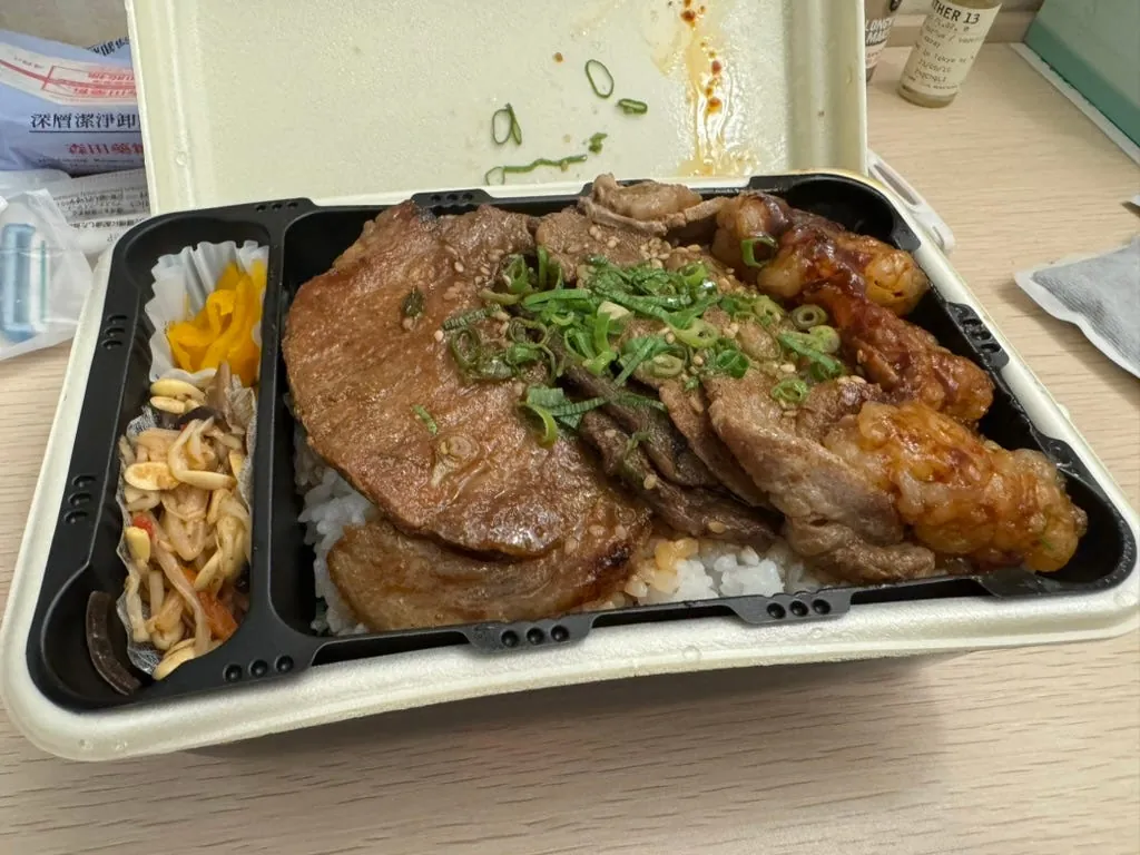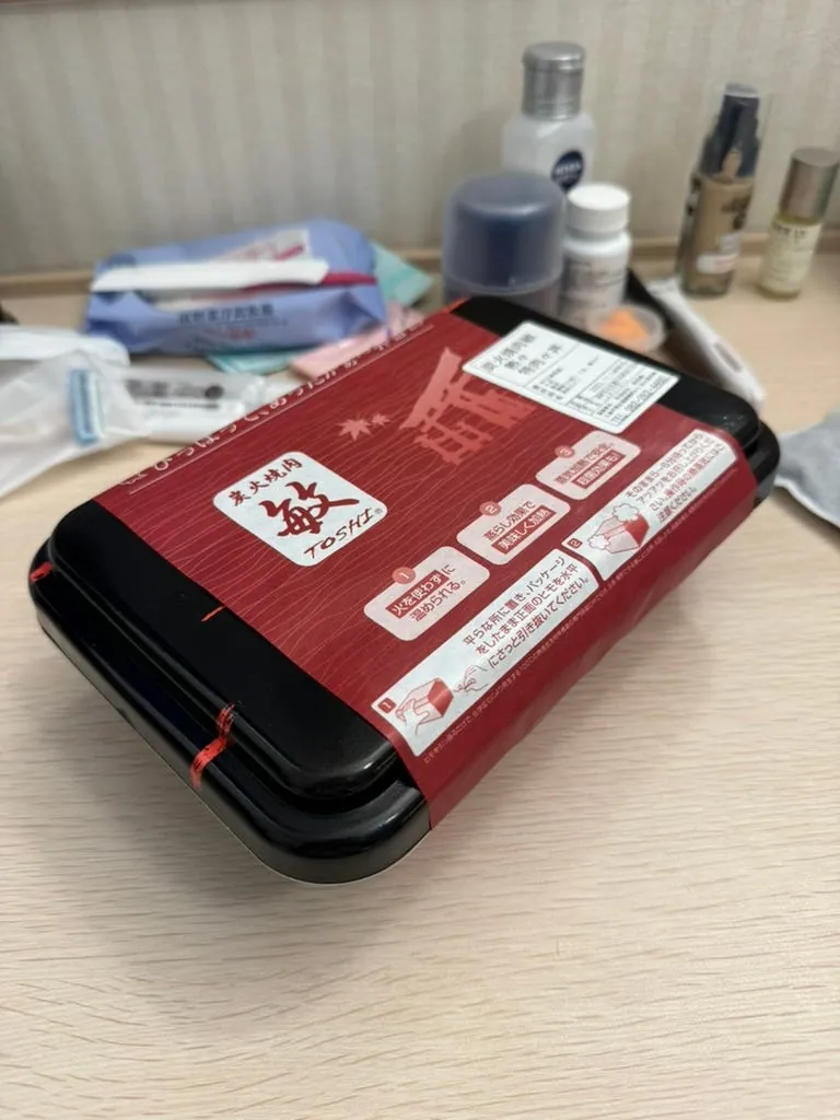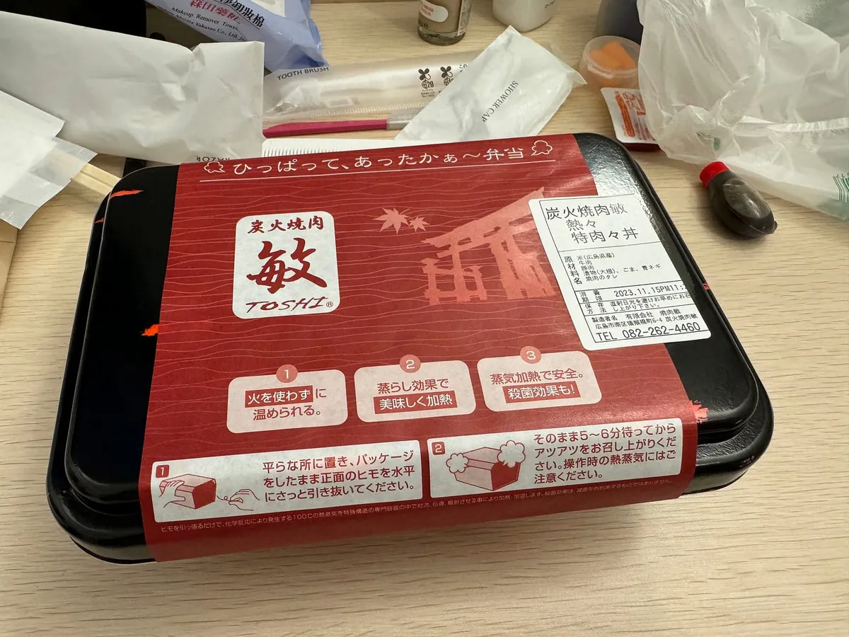 福山に戻った後、すぐに広島行きの列車に乗り、この静かで平和な街に別れを告げました。夕食はホテルへの道中にある「炭火焼肉 敏 猿猴橋店」で焼肉弁当をテイクアウトしました。