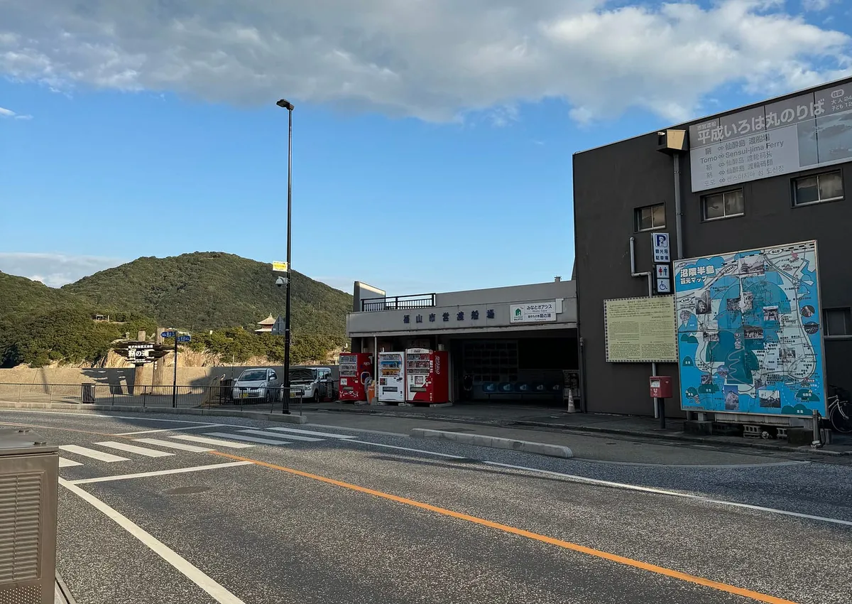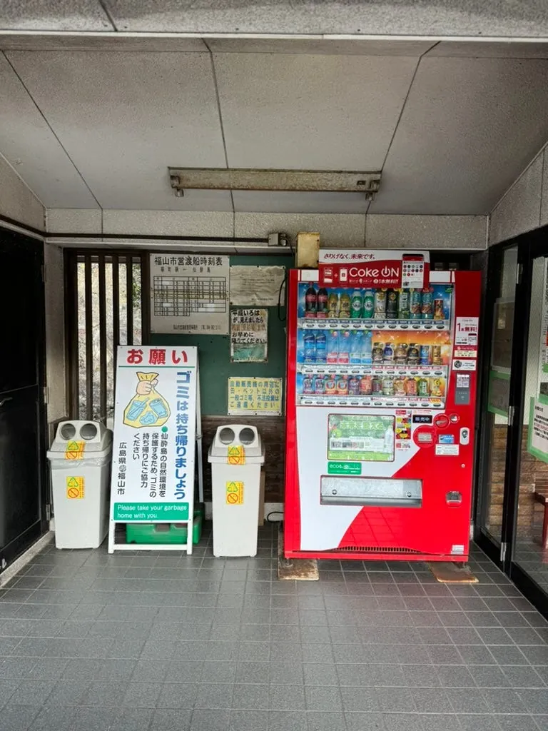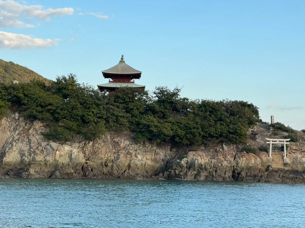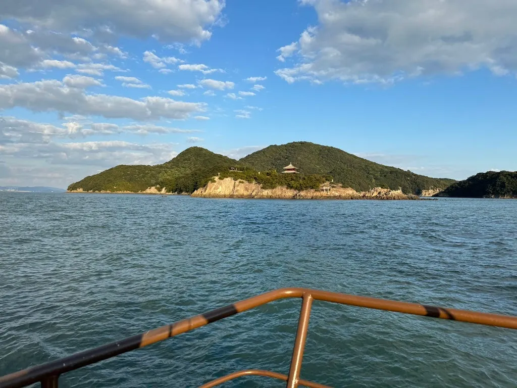 約15分ほどしか滞在せず、行く場所がなかったのでフェリーの出発を待ちました;この場所は寂しいですが、自動販売機はありました!帰り道に遠くの弁天島を近くで見ました。海の中に孤立して立つ小さな島と鳥居です。
