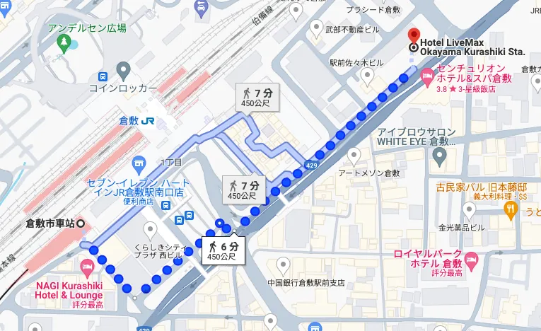 場所:地図とほぼ同じで、倉敷駅の外にあり、徒歩約5分でとても便利です。
