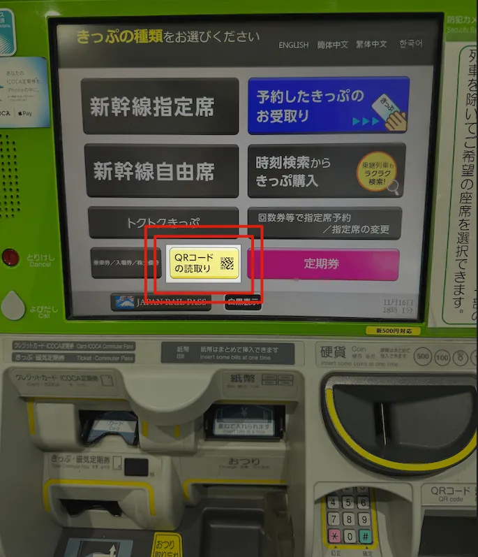 最後に台湾の皆さんが何度も試した結果、左下の「 QRコードの読取り 」黄色いボタンを使って交換する必要があるとわかりました。ボタンを押すと直接QRコードをスキャンできます。(JRの機械がアップデートされたのだと思います)