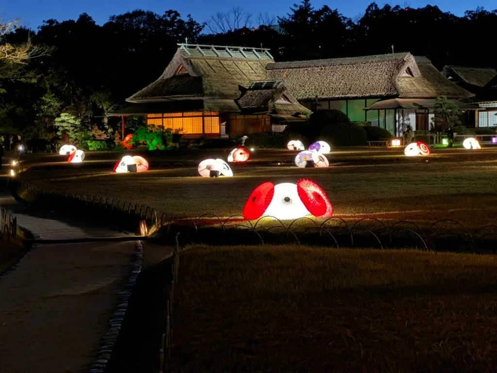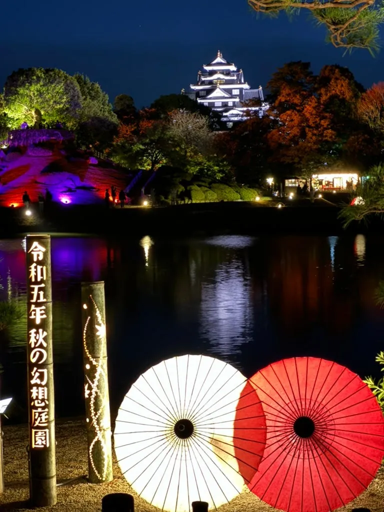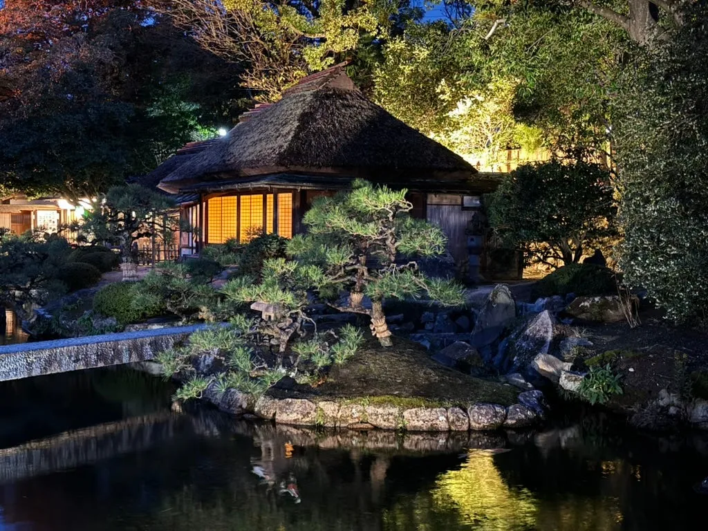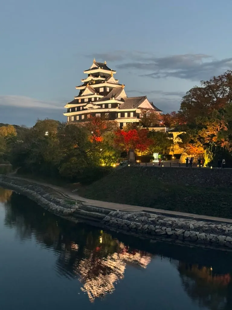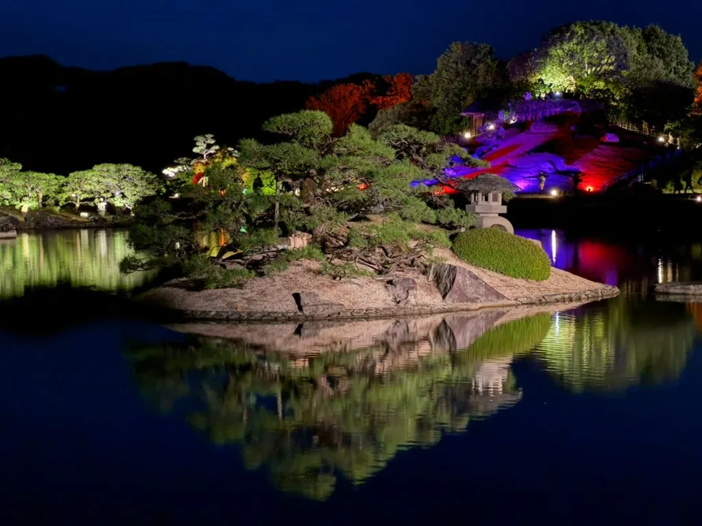 最初の目的地は岡山後楽園で、夜のライトアップはとてもロマンチックで美しいです。