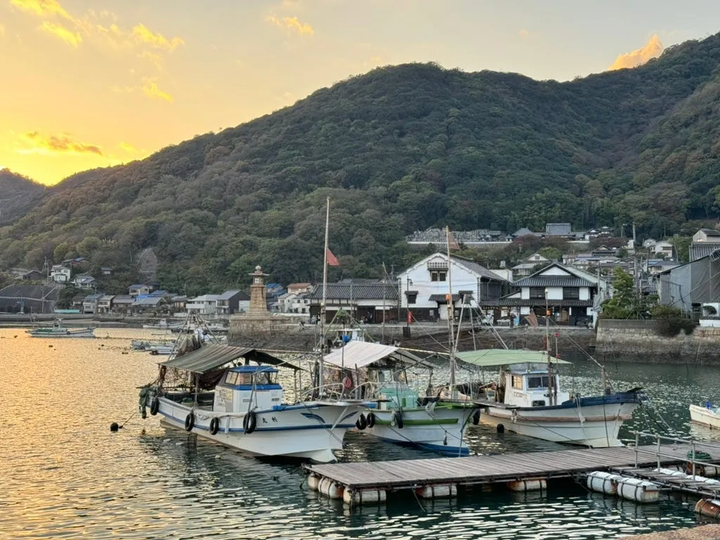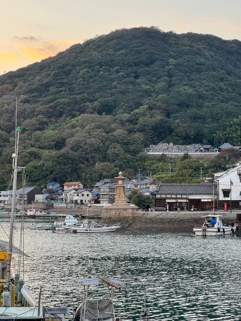 鞆の浦に戻る頃には夕方に近く、ふらふらと港へ向かい常夜燈と和風の街並みを眺めました。道中、多くの人や写真愛好家がすでに港の階段に座り、カメラをセットして夕日の到来を待っていました。