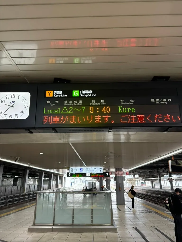 初日にJRパスを交換するときにちょうど手間取って、同じく困っている台湾人のグループに出会い、前の人と交代で試してやっと成功しました。彼女も広島に行く予定で、改札で詰まっているのを教えてあげて、たまたま同じ下りの列車を買い、彼女は自由席を選び、二人とも先にコンビニに寄りたいと思っていて、同じ業界だったので話が弾み、どちらも一人旅だったため、初日から一緒に同じ行程を回ることになりました。