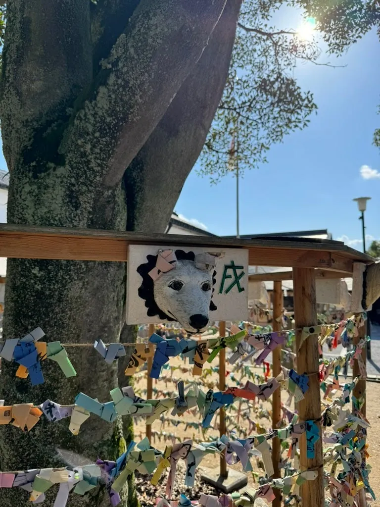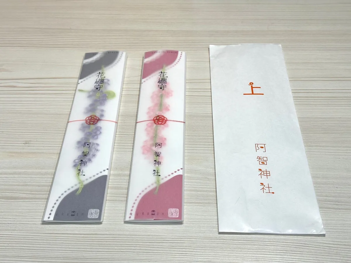 阿智神社は大きくはありませんが、有名な絵馬亭があります。悪いおみくじを引いた場合は、自分の干支に対応する獣首に結ぶことができます。また、良縁を願う「花纏守」もあります 花纏守 :