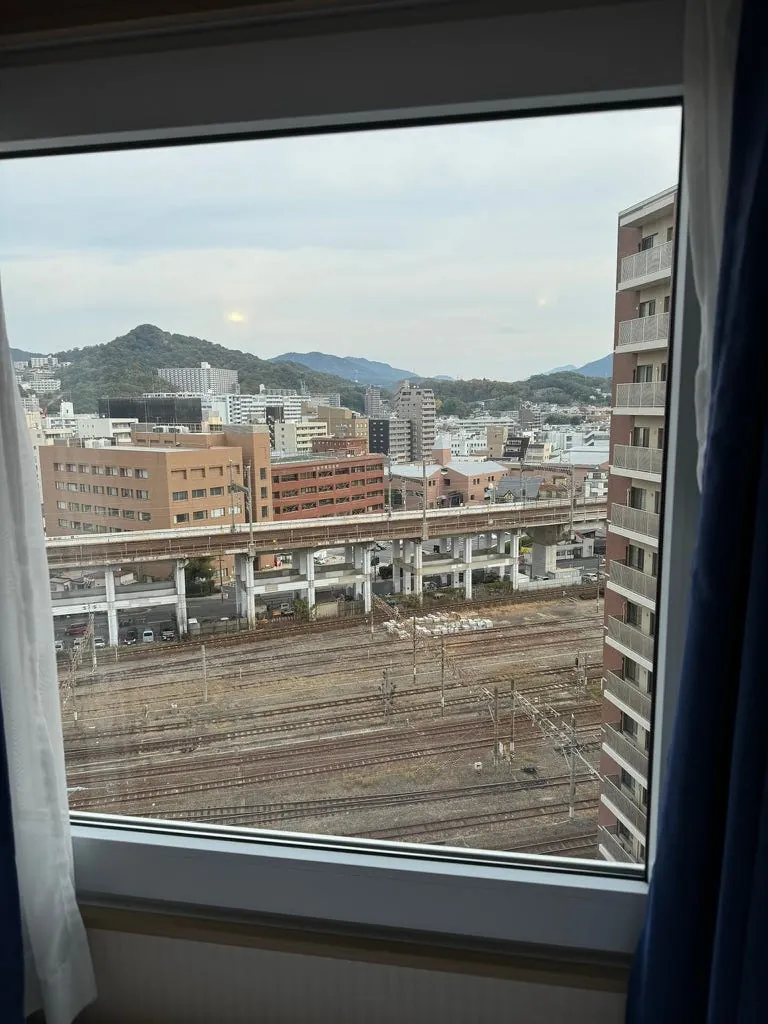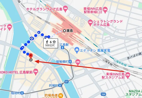 場所:広島駅から比較的近いですが、実際に歩くと大通りや橋を渡る必要があり(約10分)、前の宿泊地から歩くと約15分で便利です。