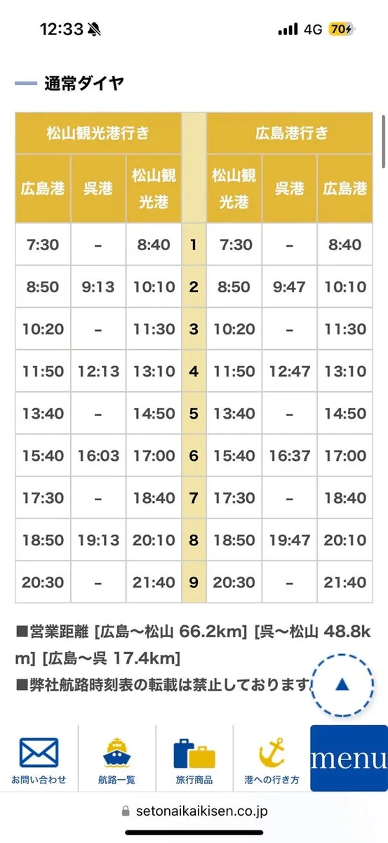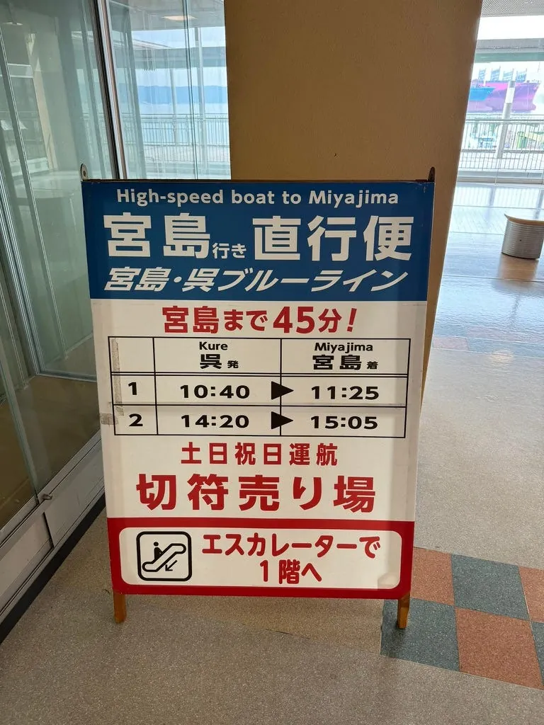 呉市や広島に来る予定の方への行程参考として、呉市からは船で宮島や広島に行くこともできます。今回は船の時間が合わなかったため、船で広島に戻るのは断念しました。