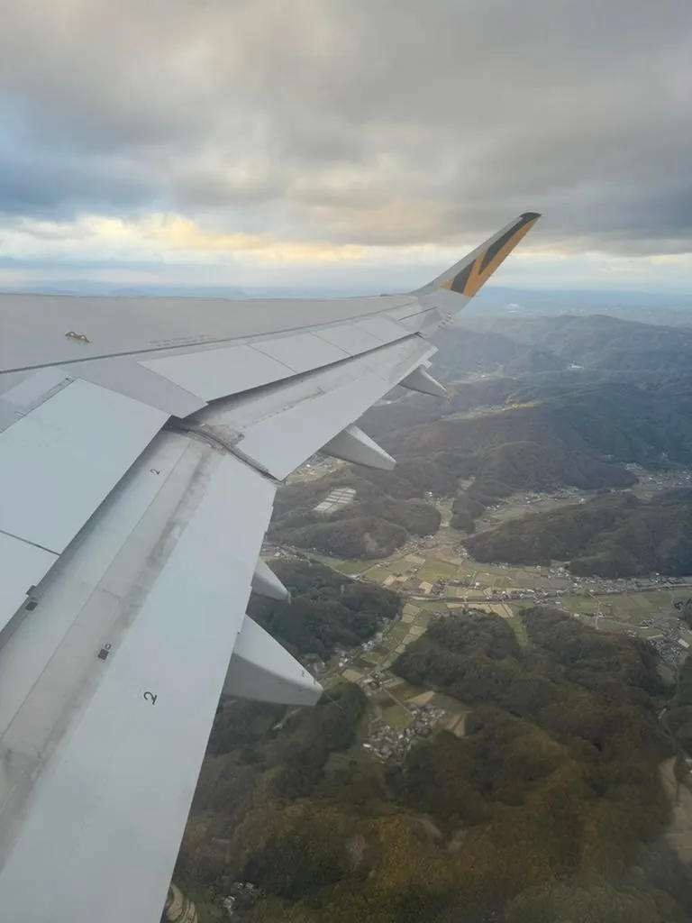 11:07 出発、14:11 OKJ(岡山桃太郎空港)到着;途中でお腹が空いたときに食べ物を食べようとしたが、虎航は機内への持ち込み飲食が禁止されていることがわかった(ピーチは特に規定なし)。なので我慢して、飛行機を降りて入国前の隅で食べてから入国しようと思った。